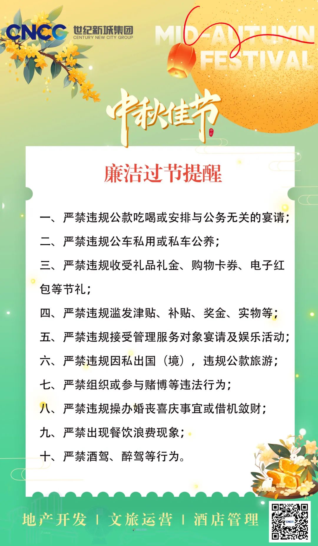 風(fēng)清氣正度中秋,清風(fēng)廉韻迎國慶。中秋佳節(jié)將近,世紀(jì)新城集團(tuán)紀(jì)委溫馨提示:節(jié)日期間勿忘廉潔自律,全體黨員干部職工要崇廉尚儉,時(shí)刻將紀(jì)律和規(guī)矩挺在前面,守住底線,不碰紅線,共同營造風(fēng)清氣正的節(jié)日氛圍。