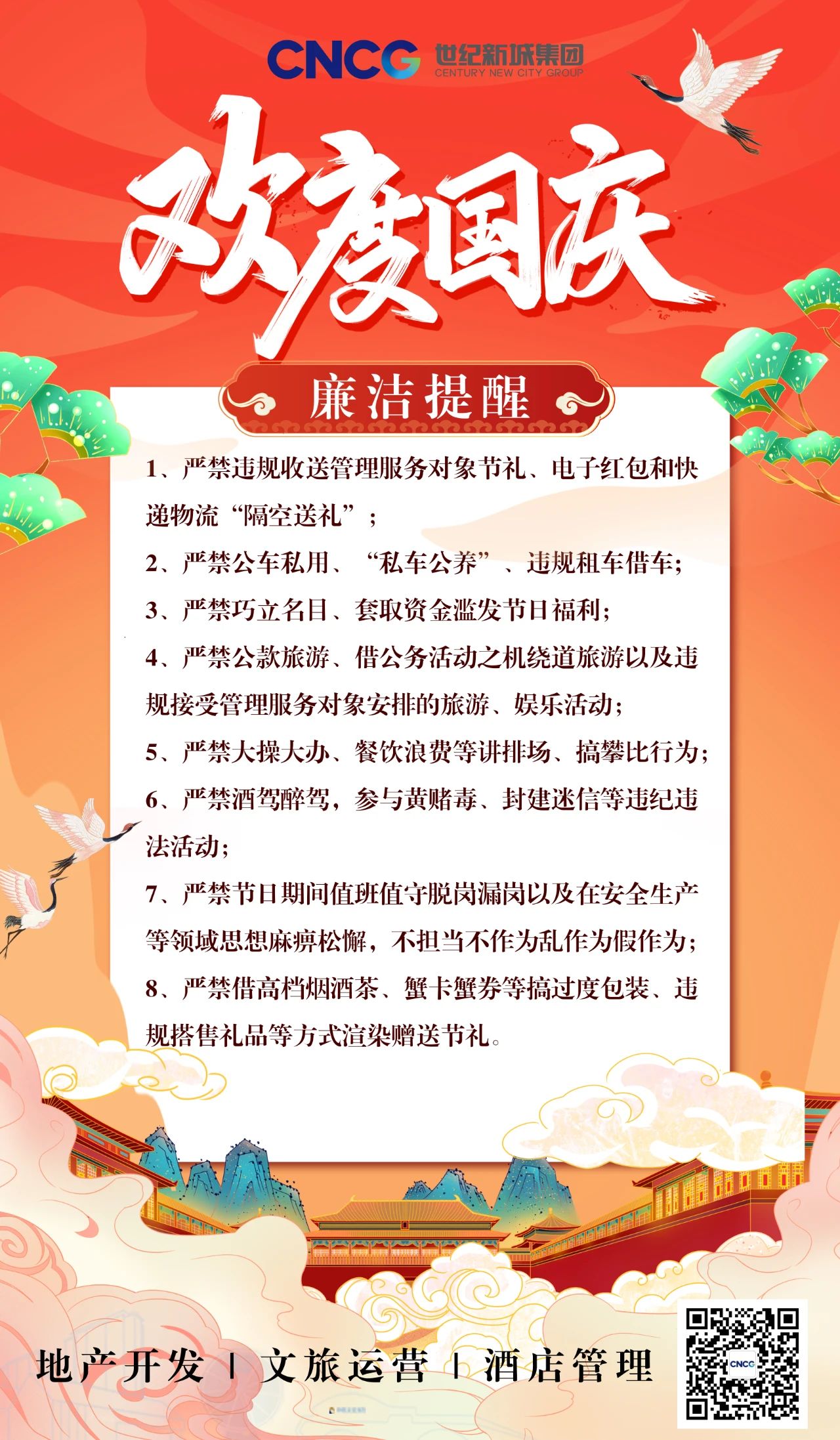 秋風(fēng)送爽,丹桂飄香。2024年國慶佳節(jié)將至,為深入貫徹全面從嚴(yán)治黨工作要求,進(jìn)一步鞏固落實(shí)中央八項(xiàng)規(guī)定精神成果,馳而不息糾治“四風(fēng)”倡樹新風(fēng),積極營造風(fēng)清氣正的節(jié)日氛圍,世紀(jì)新城集團(tuán)紀(jì)委現(xiàn)向全體黨員干部職工作出如下提醒: