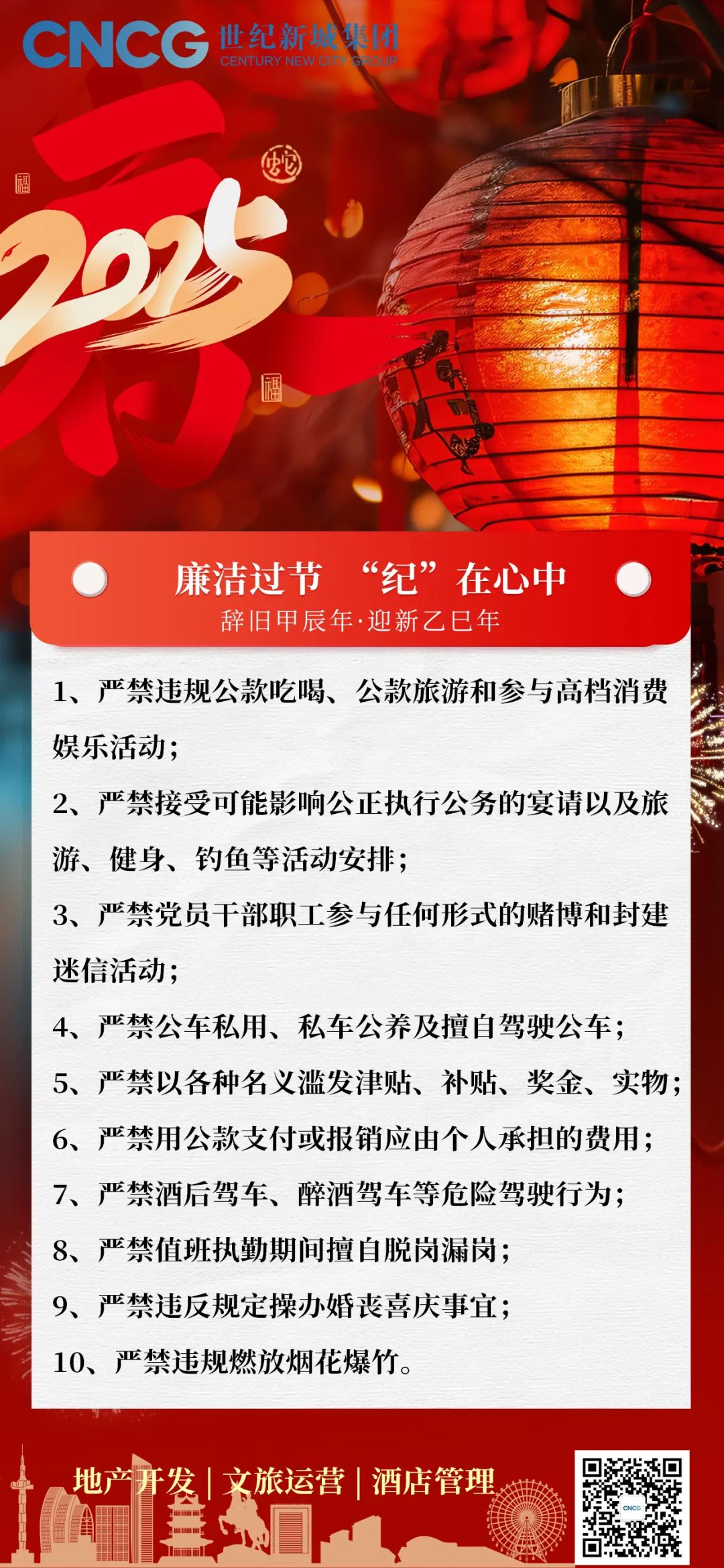 律回春暉漸,萬象始更新。為深入貫徹黨的二十大和二十屆二中、三中全會(huì)精神,從嚴(yán)落實(shí)中央八項(xiàng)規(guī)定精神,持續(xù)強(qiáng)化春節(jié)期間作風(fēng)紀(jì)律,營造廉潔、文明、節(jié)儉的節(jié)日新風(fēng),世紀(jì)新城集團(tuán)紀(jì)委在此發(fā)出廉潔過節(jié)溫馨提示,希望集團(tuán)全體黨員干部職工嚴(yán)格落實(shí)中央八項(xiàng)規(guī)定精神及其實(shí)施細(xì)則,遵守廉潔自律準(zhǔn)則,嚴(yán)格做到以下“十個(gè)嚴(yán)禁”,過一個(gè)廉潔文明、歡樂祥和、風(fēng)清氣正的節(jié)日。