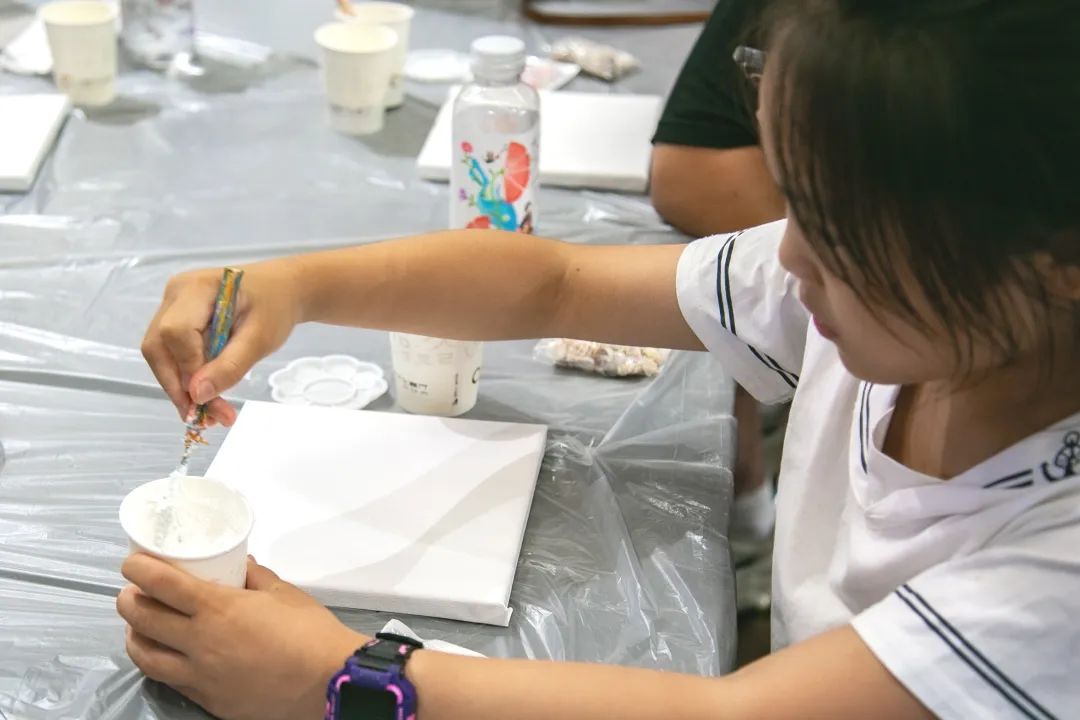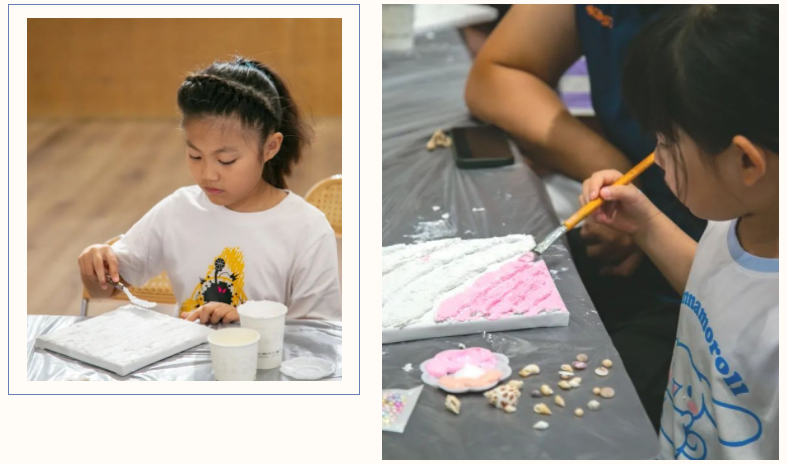 大家構(gòu)思分布海浪的結(jié)構(gòu)和位置,小心翼翼的用鉛筆在畫(huà)板上畫(huà)出大致輪廓,再將石英砂混入丙烯顏料增加肌理感。小巧的刮刀變成了靈活的畫(huà)筆,大家用不同手法“刮”出各種縱橫交錯(cuò)、凹凸不平的紋理,最后再搭配上貝殼以及珍珠裝飾,一幅幅精美獨(dú)特的作品由此誕生。
