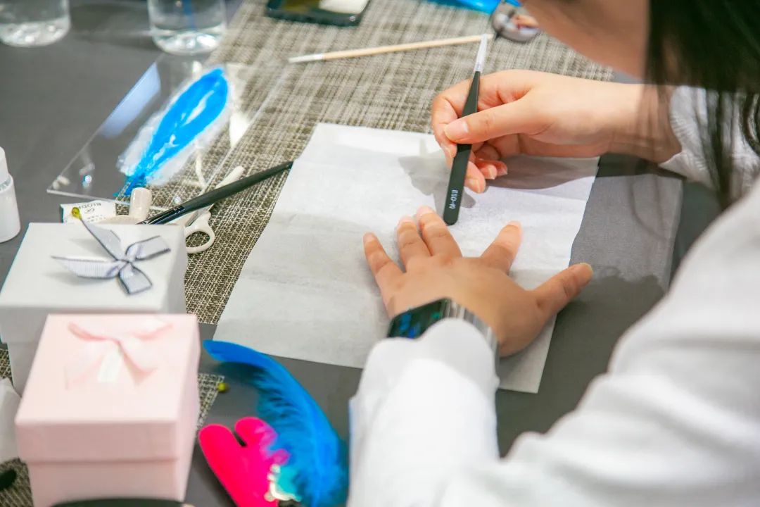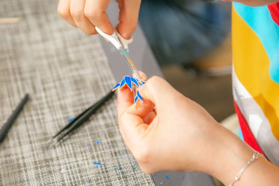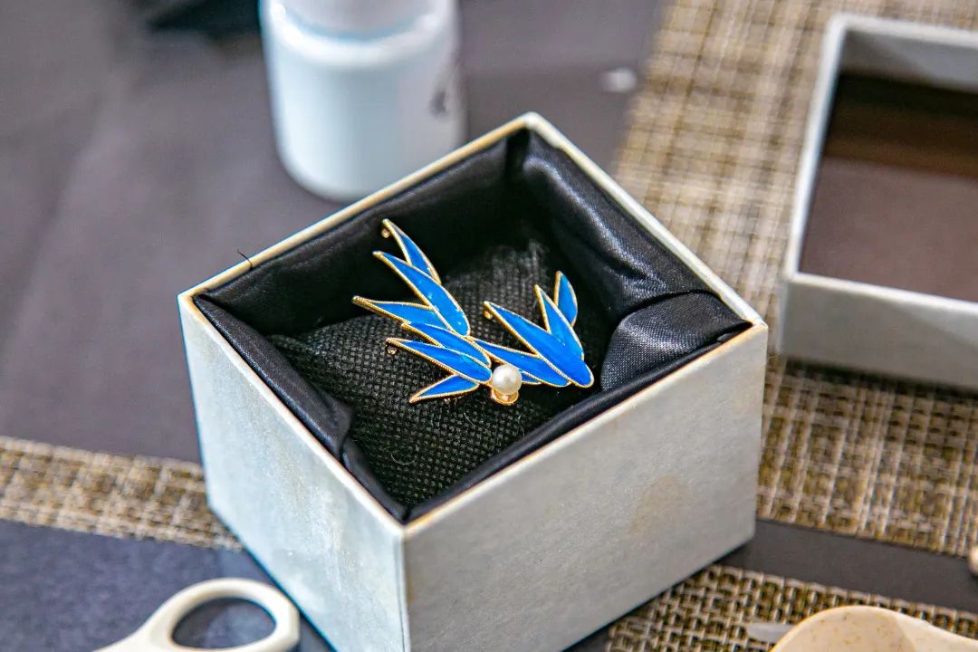 平穩(wěn)的案板,端方的紙筆,精細(xì)的工具,大家在歡聲笑語(yǔ)中,邊學(xué)邊做邊交流,描、剪、填、粘、鑲......每個(gè)步驟都大家全神貫注、小心翼翼、精益求精,好像一位位技藝嫻熟的工匠。不一會(huì)兒,巧手“工匠”們精心制作的點(diǎn)翠胸針就完成了,在紛繁復(fù)雜的工藝之下,一件件精美的作品宛若一只只翩然起舞的藍(lán)蝶、展翅欲飛的青鳥,凝結(jié)著大家勞動(dòng)的愉悅和美的創(chuàng)造,大家在完成作品的同時(shí),對(duì)傳統(tǒng)非遺文化點(diǎn)翠技藝也有了更深的感知。
