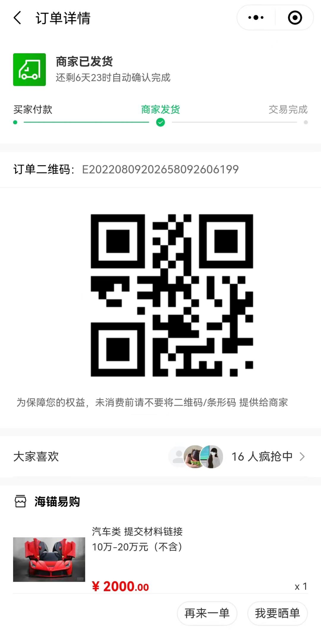 1、完成購(gòu)車(chē)、獲取到正式牌照或臨時(shí)牌照后,掃描平臺(tái)方提供給商戶的二維碼,點(diǎn)擊“提交材料”。