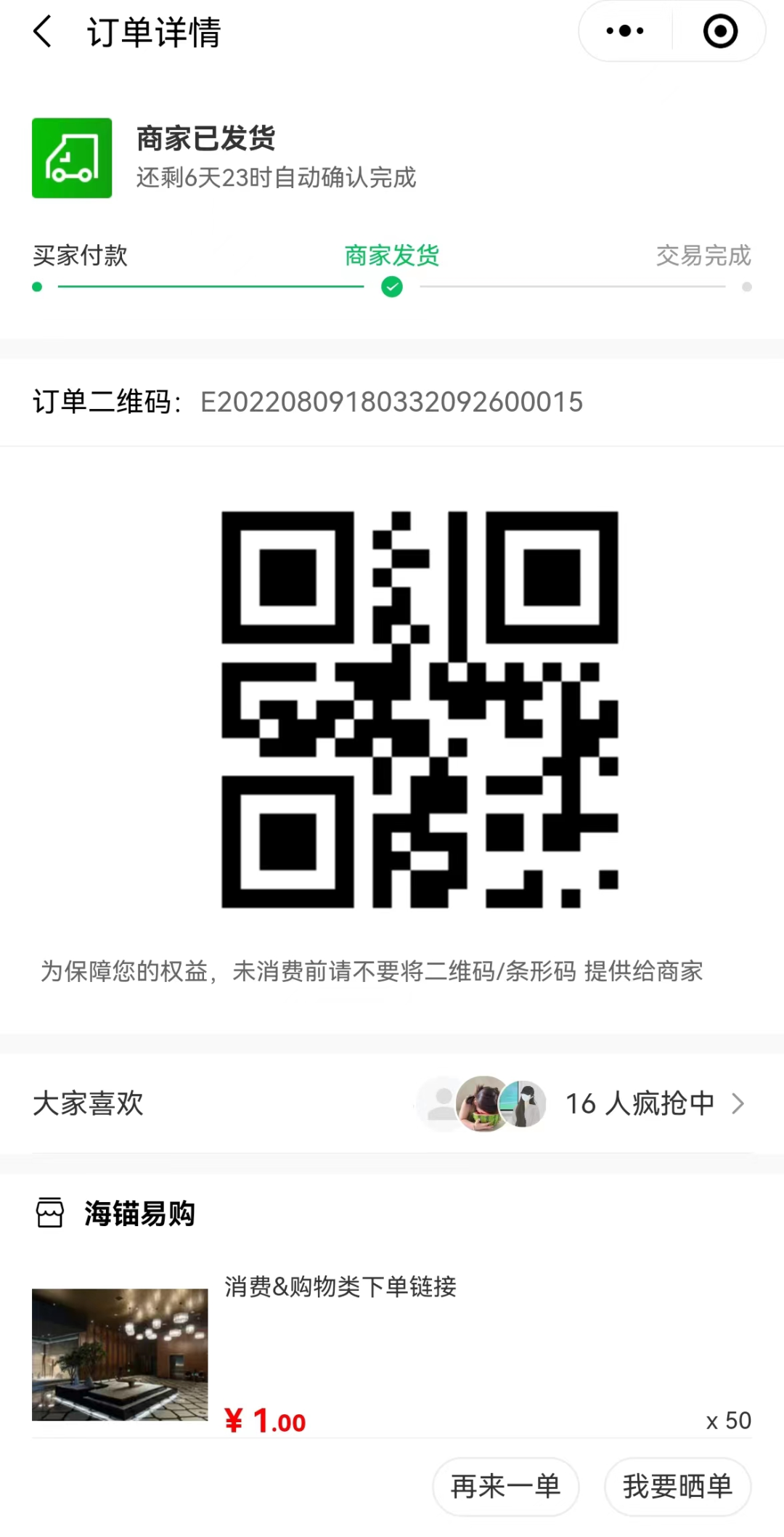 1、在商家消費(fèi)后,掃描平臺(tái)方提供給商戶的二維碼,點(diǎn)擊“立即購(gòu)買(mǎi)”。