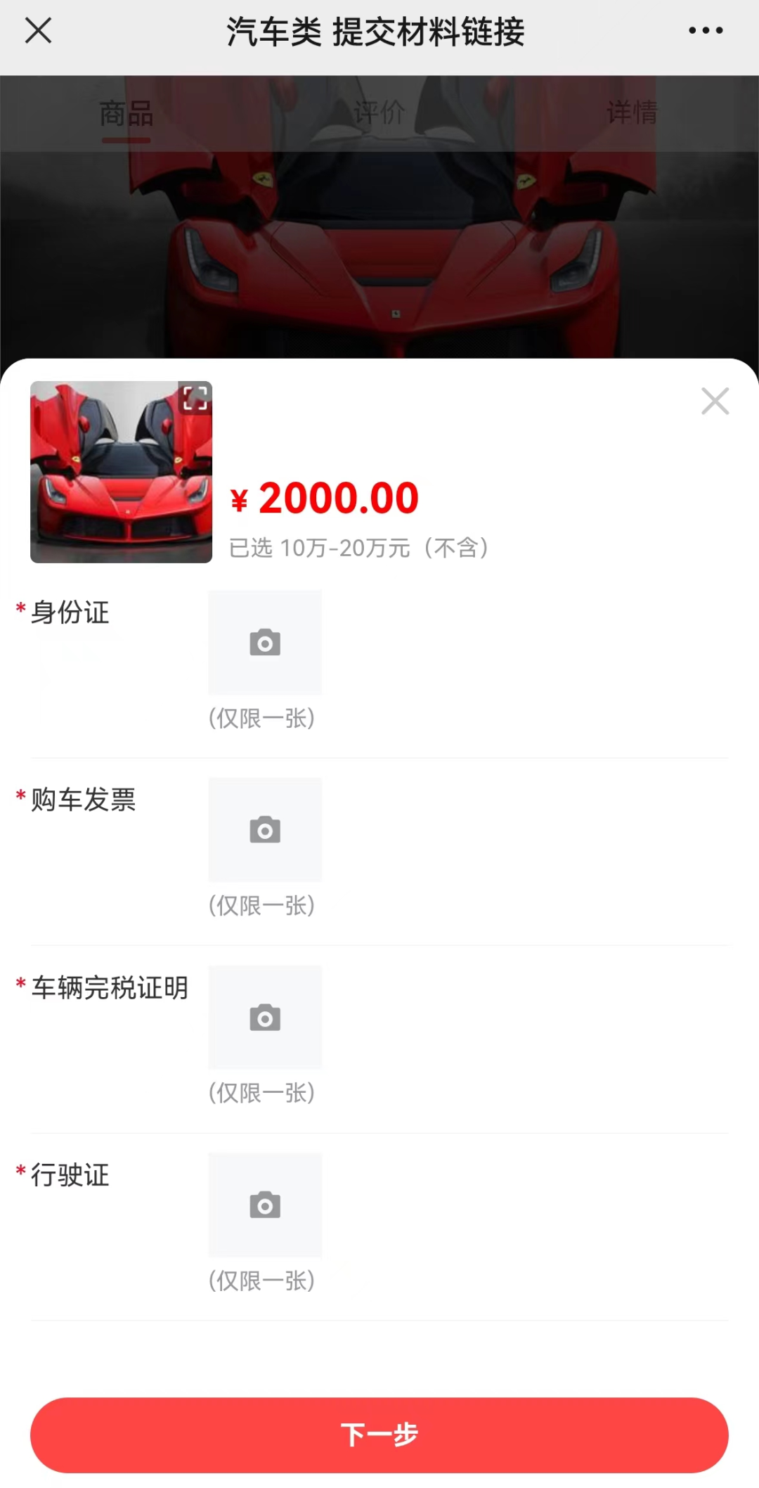 2、按照票面金額(不含稅價(jià))選取車(chē)價(jià)區(qū)間,填寫(xiě)手機(jī)號(hào)碼、姓名,上傳身份證照片、購(gòu)車(chē)發(fā)票照片、車(chē)輛完稅證明照片、行駛證照片,點(diǎn)擊“下一步”。