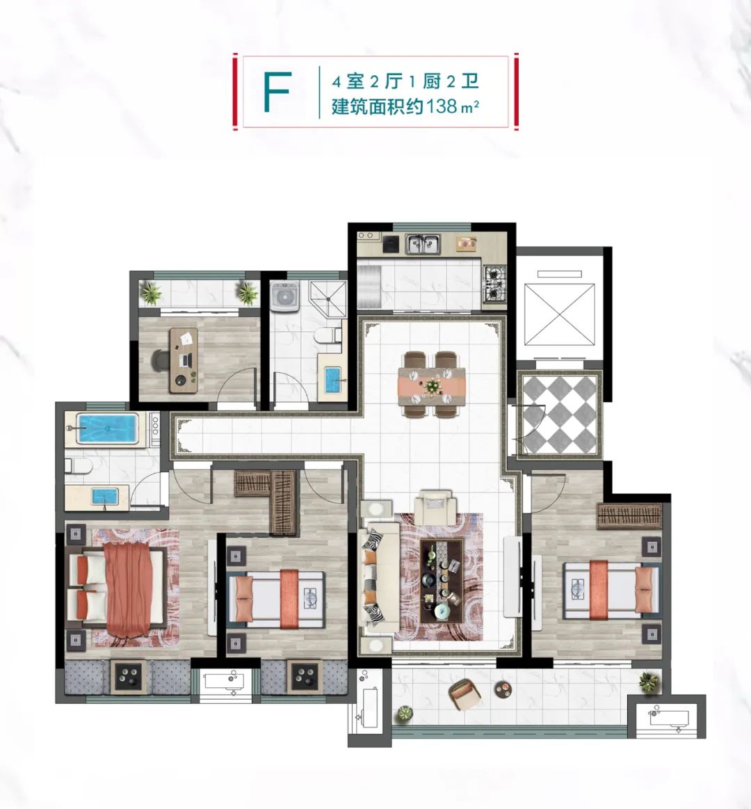 建面約125、138㎡四室兩廳兩衛(wèi)