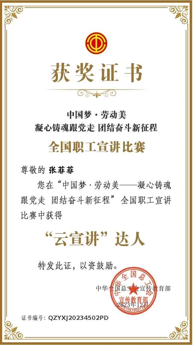喜報(bào)!集團(tuán)職工張菲菲榮獲全國(guó)職工宣講比賽“云宣講”達(dá)人稱號(hào)