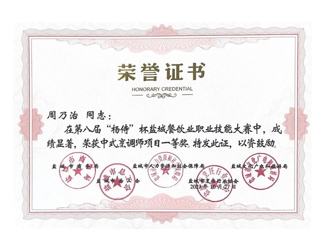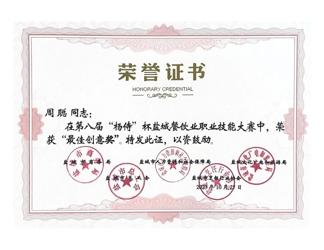 近日,由鹽城市商務(wù)局、鹽城市人力資源和社會(huì)保障局、鹽城市文化廣電和旅游局、鹽城市總工會(huì)、鹽城市烹飪行業(yè)協(xié)會(huì)聯(lián)合主辦的第八屆楊侍生態(tài)美食節(jié)暨“楊侍”杯鹽城餐飲業(yè)職業(yè)技能大賽頒獎(jiǎng)典禮在中國(guó)最美鄉(xiāng)村——郭猛鎮(zhèn)楊侍村落下帷幕,集團(tuán)下屬公司世紀(jì)城市酒店以精湛業(yè)務(wù)技能分獲1個(gè)團(tuán)體一等獎(jiǎng)、1個(gè)“優(yōu)秀組織獎(jiǎng)”、3項(xiàng)榮譽(yù)稱(chēng)號(hào)和8項(xiàng)個(gè)人單項(xiàng)獎(jiǎng),綜合成績(jī)?cè)賱?chuàng)新高。