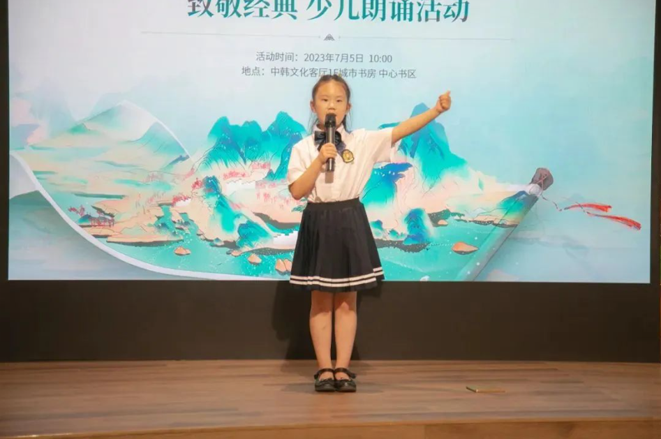 為激發(fā)少年兒童的愛國情懷,讓紅色基因代代相傳,7月5日,中韓文化客廳舉辦“致敬經(jīng)典 童心飛揚”少兒朗誦活動?;顒蝇F(xiàn)場,孩子們朗誦了《讀中國》《少年夢 中國夢》《月光下的中國》等經(jīng)典紅色篇目,用稚嫩的童音和純真的心靈表達自己對祖國最真切的情感,展現(xiàn)了朝氣蓬勃的精神風(fēng)貌,抒發(fā)了對經(jīng)典文化的無限熱愛。
