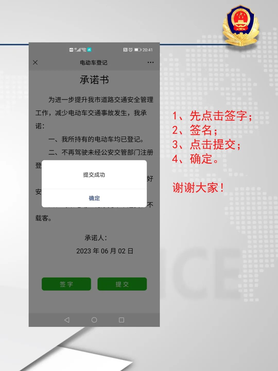 第5步:仔細(xì)閱讀承諾書,讀完后點(diǎn)擊“簽字”,隨后簽名,簽名完成后,再點(diǎn)擊“提交”按鈕,完成全部電動(dòng)車登記工作。