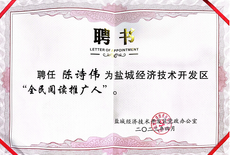 近日,集團新嘉源“融書閣”榮獲2022年度鹽城市全民閱讀“十百千萬”工程優(yōu)秀典型——十佳閱讀空間、經開區(qū)“優(yōu)秀閱讀空間”;中韓文化客廳“廳見”青年讀書匯獲評經開區(qū)“優(yōu)秀閱讀組織”;中韓文化客廳店長、“廳見”青年讀書匯負責人陳詩偉被聘為經開區(qū)“全民閱讀推廣人”。