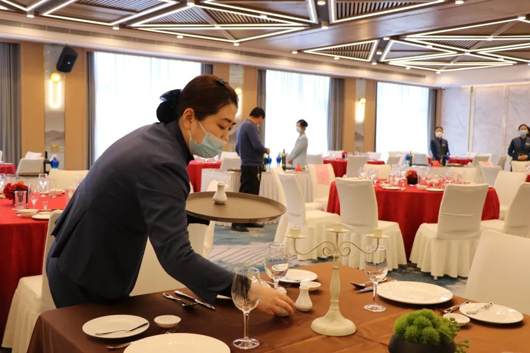 “一張10人臺(tái)的餐桌,碗、勺、筷、碟、酒杯等需在17分鐘內(nèi)按規(guī)范擺好;餐碟、筷子尾距桌邊1.5CM餐具,間距1CM。”32名員工正在中韓商匯三樓大廳進(jìn)行緊張的現(xiàn)場(chǎng)實(shí)操考試,由3名考評(píng)員、2名現(xiàn)場(chǎng)督導(dǎo)、1名餐飲業(yè)指導(dǎo)老師組成的考評(píng)團(tuán),在現(xiàn)場(chǎng)仔細(xì)觀察員工們的操作。“餐廳服務(wù)員的技能等級(jí)共有五級(jí),按國(guó)家規(guī)定,每級(jí)均有相應(yīng)的待遇,級(jí)別越高待遇越好。”酒店公司總經(jīng)理丁正東說(shuō)道,這是2023年首次開(kāi)考的餐廳服務(wù)四級(jí)職業(yè)技能等級(jí)認(rèn)定考試,考試內(nèi)容分為筆試、實(shí)操、口試等環(huán)節(jié),考試內(nèi)容為餐飲服務(wù)中關(guān)于宴會(huì)服務(wù)、顧客服務(wù)等相關(guān)服務(wù)技能,有理論考試也有實(shí)操考試,均參照國(guó)家職業(yè)資格證書(shū)考核標(biāo)準(zhǔn)進(jìn)行考核認(rèn)定。