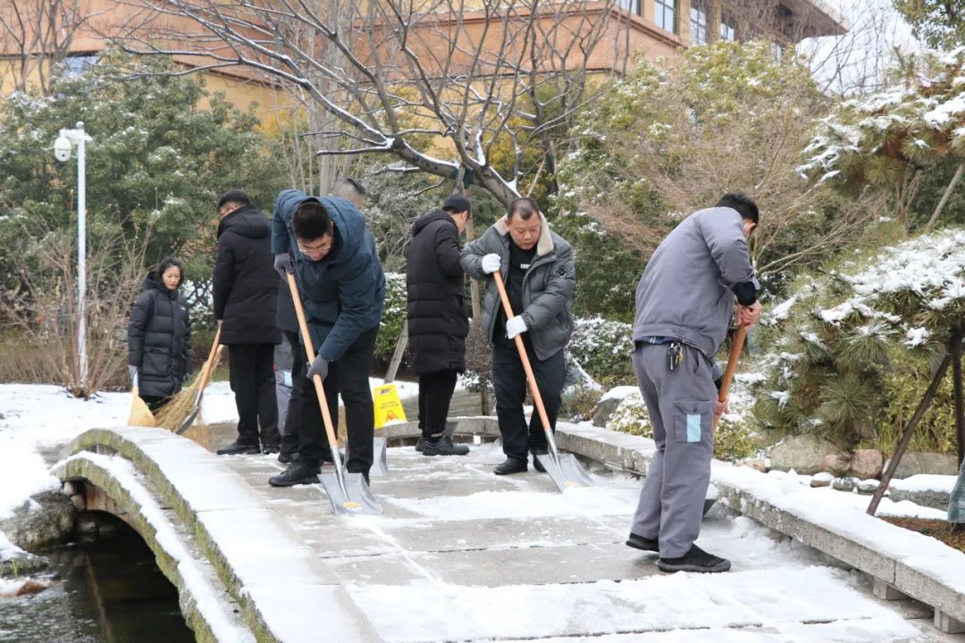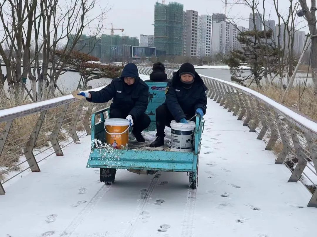 在東湖國(guó)際、東大門KK-PARK、中韓迎賓苑、中韓文化客廳、新嘉源人才公寓等項(xiàng)目現(xiàn)場(chǎng),大家個(gè)個(gè)干勁十足,清雪現(xiàn)場(chǎng)熱火朝天,鏟雪除冰行動(dòng)有序地開展著。針對(duì)部分區(qū)域積雪厚、清理難的實(shí)際,大家分工負(fù)責(zé),先清后鏟,再撒鹽......大家鏟的鏟,撒的撒,配合默契,忙碌的身影,構(gòu)成了一道靚麗的風(fēng)景線。