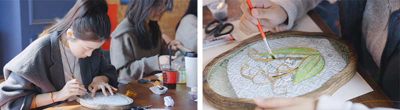“這個曲線好難固定呀!”“這個需要巧勁和耐心,你用鑷子引導試試。”活動中大家認真聆聽制作方法,興致盎然地討論制作心得。經(jīng)過掐絲、琺瑯彩填充和燒制,看似普通的金絲奇跡般地構(gòu)成了一個又一個精巧細致的圖案,散發(fā)出立體、流暢的美感。一縷金絲流轉(zhuǎn),掐出指尖上的非遺之美,大家在專注、歡樂的時光中深深感受到了中國傳統(tǒng)非遺文化的魅力。