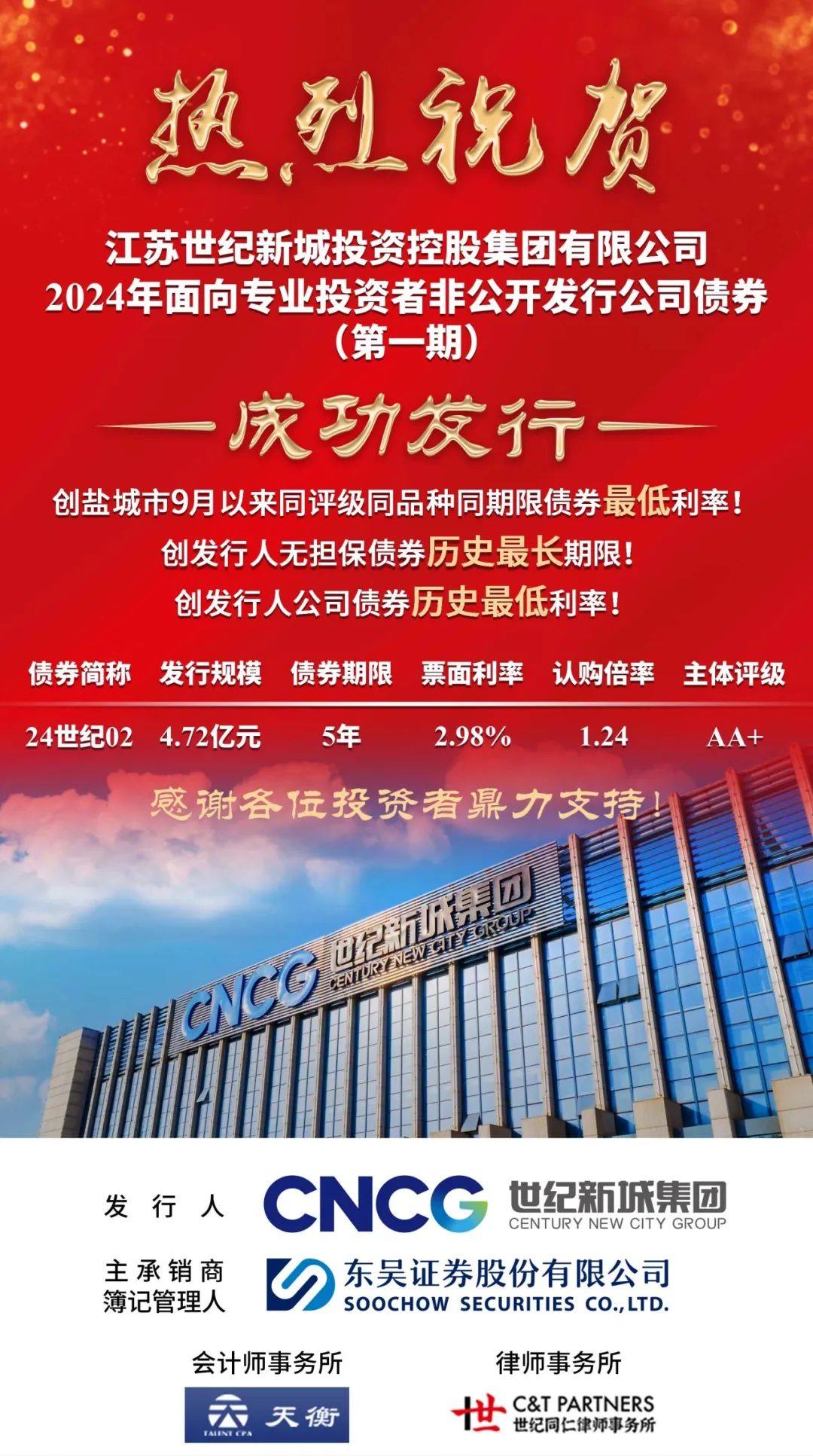 2024年10月25日,江蘇世紀(jì)新城投資控股集團(tuán)有限公司2024年面向?qū)I(yè)投資者非公開發(fā)行公司債券(第一期)在上海證券交易所成功發(fā)行。本期債券由東吳證券股份有限公司擔(dān)任主承銷商及簿記管理人,根據(jù)主流發(fā)行方式和市場(chǎng)行情,最終本期債券發(fā)行規(guī)模為4.72億元,發(fā)行期5年,發(fā)行利率為2.98%。本期債券是我司自獲AA+評(píng)級(jí)以來(lái)首次發(fā)行,創(chuàng)我司公司債券歷史最低利率!創(chuàng)我司無(wú)擔(dān)保債券歷史最長(zhǎng)期限!創(chuàng)鹽城市9月以來(lái)同評(píng)級(jí)同品種同期限債券最低利率!該筆公司債券的發(fā)行對(duì)優(yōu)化我司債務(wù)融資結(jié)構(gòu)具有積極意義。