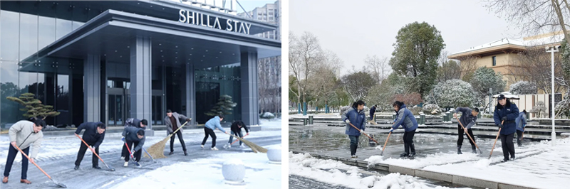 寒潮突至,降雪來襲,道路積雪結(jié)冰給住客出行帶來諸多不便與安全隱患。為全力保障住客出行安全,酒店公司迅速響應(yīng),全體員工聞令而動,不畏凜冽寒風(fēng),滿懷熱忱投入到清雪除冰工作中。